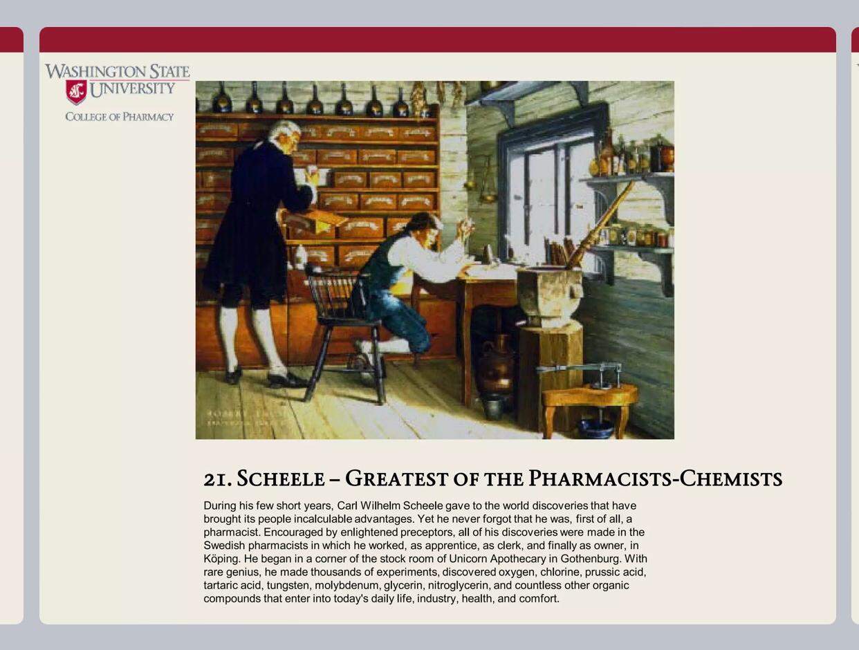 Carl Wilhelm Scheele, kısa yaşamı boyunca, dünyaya sayısız fayda sağlayan keşifler yaparak insanlara haddi hesabı olmayan avantajlar kazandırdı. Ancak, o, her şeyden önce bir eczacı olduğunu hiçbir zaman unutmadı. Ortaokuldan mezun olduktan sonra Göteborg’daki Unicorn Eczanesi’nin deposunun bir köşesinde eczacı çırağı olarak işe başladı. Aydın öğretmenleri tarafından teşvik edilen Carl Wilhelm Scheele, tüm keşiflerini çırak ve kâtip olarak çalıştığı ve sonunda da sahibi olduğu Köping’de yer alan İsveç eczanelerinde gerçekleştirdi. Nadir bir deha olan Scheele, binlerce deney yaparak oksijen, klor, hidrosiyanik asit, tartarik asit, tungsten, molibden, gliserin, nitrogliserin ve bugünün günlük hayatında, endüstrisinde, sağlığında ve konforunda yer alan sayısız organik bileşiği keşfetti.
