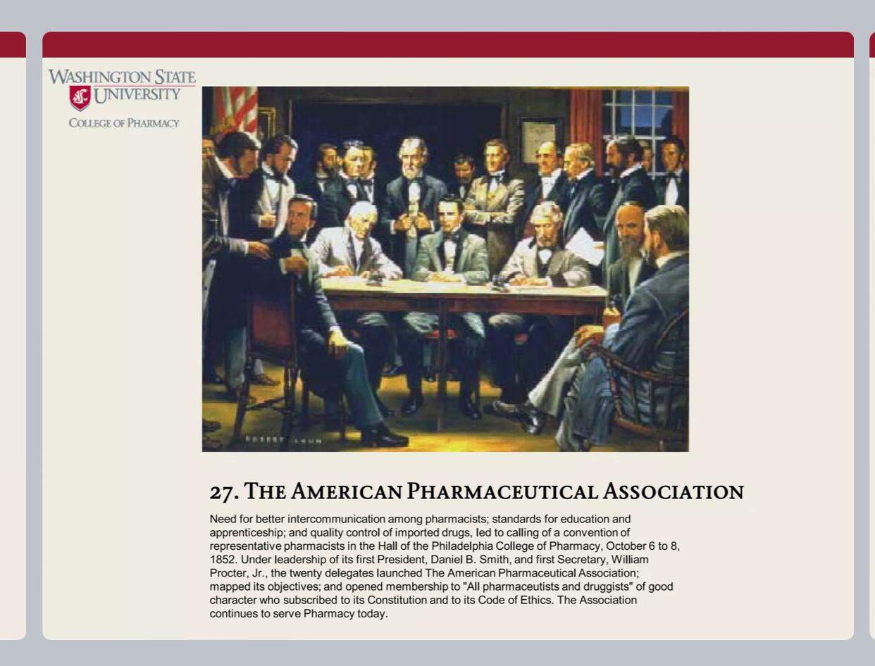 Eczacılar arasında daha iyi iletişim ihtiyacı; eğitim ve çıraklık standartları; ve ithal ilaçların kalite kontrolü, 1852 yılı 6-8 Ekim tarihleri arasında Philadelphia Eczacılık Koleji Salonunda temsili eczacıların bir kongresinin çağrılmasına yol açtı.