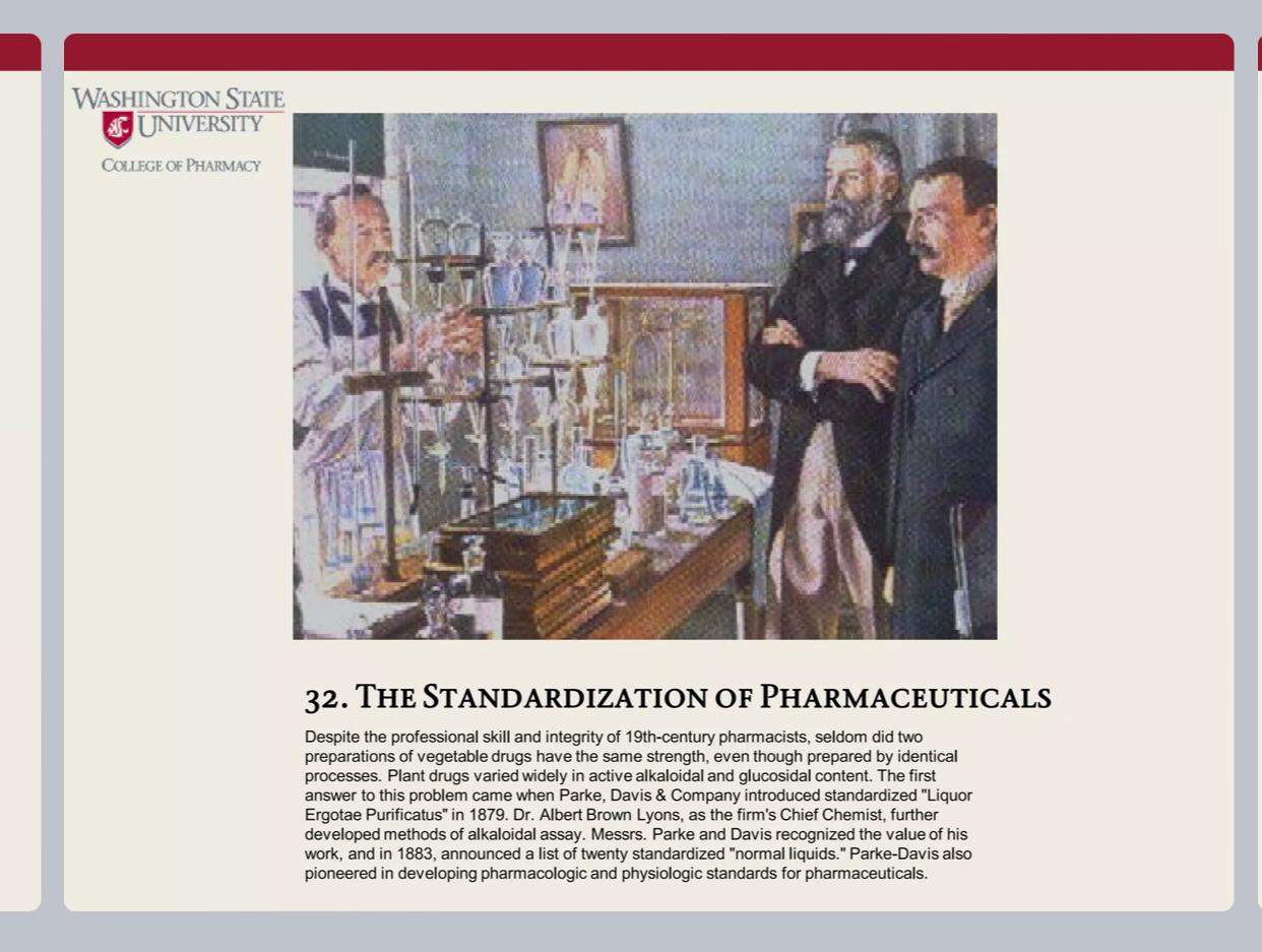 Eczacıların profesyonel becerilerine ve dürüstlüklerine rağmen, aynı işlemlerle hazırlanmış olsalar bile, iki bitkisel ilaç müstahzarının aynı güce sahip olduğu nadiren görülürdü. Bitki ilaçları, aktif alkaloidal ve glukozidal içerikte büyük farklılıklar göstermiştir. Bu sorunun ilk cevabı, Parke, Davis & Company’nin standartlaştırılmış “Likör”ü piyasaya sürmesiyle geldi. Ergotae Purificatus” 1879’da. Dr. Albert Brown Lyons, firmanın Baş Kimyageri olarak, ayrıca alkaloidal analiz yöntemleri geliştirdi. Messrs. Parke ve Davis onun değerini anladılar. Çalışmasını ve 1883’te yirmi standartlaştırılmış “normal sıvı” listesini duyurdu. Parke-Davis ayrıca farmasötikler için farmakolojik ve fizyolojik standartların geliştirilmesine öncülük etmiştir.