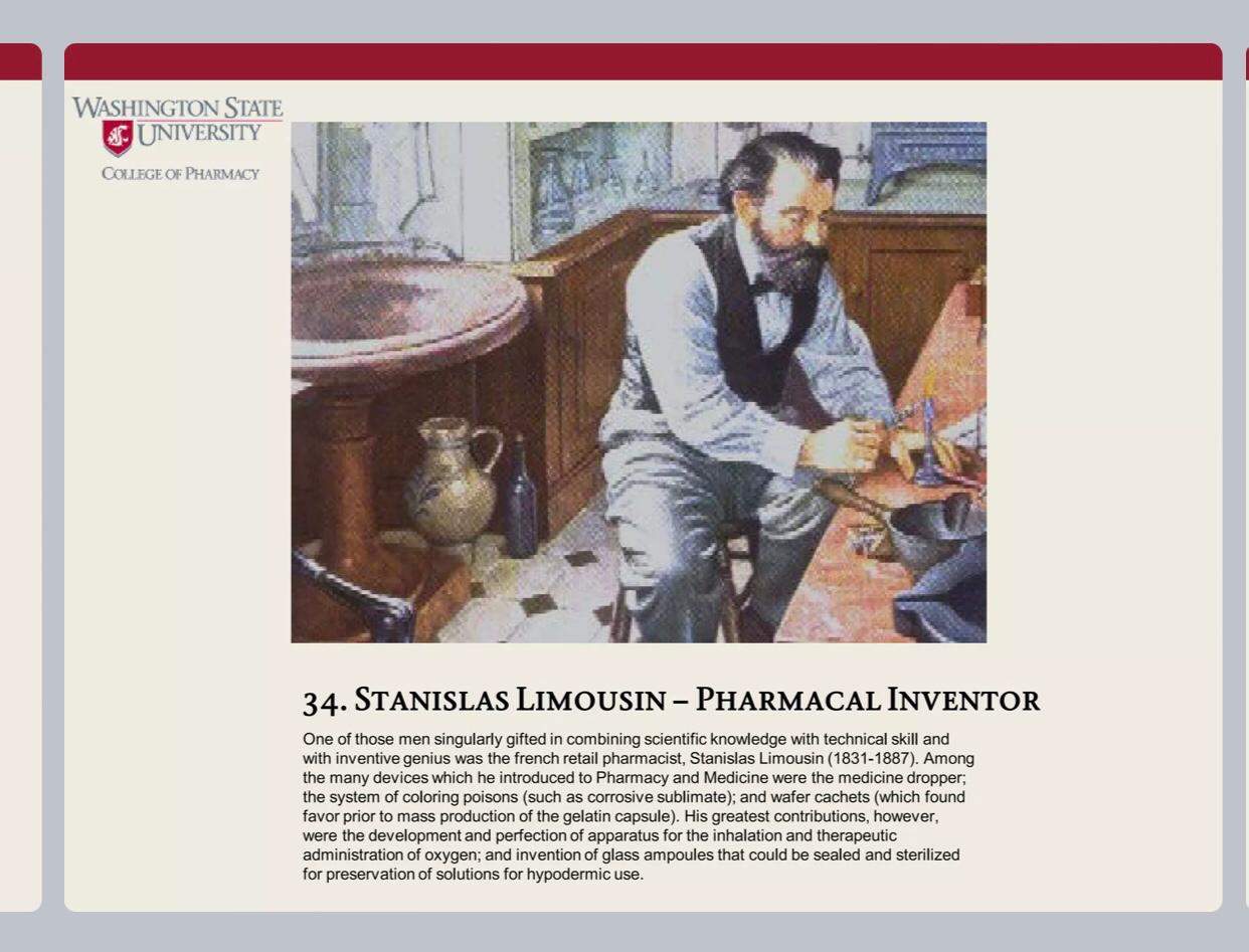 Bilimsel bilgiyle teknik beceriyi ve yaratıcı dehayı birleştirme konusunda benzersiz bir yeteneğe sahip olan adamlardan biri, Fransız perakende Eczacısı Stanislas Limousin’di (1831-1887). Eczacılık ve tıbba tanıttığı pek çok cihaz arasında ilaç damlalığı, zehirleri renklendirme sistemi (aşındırıcı süblime gibi); ve (jelatin kapsülün seri üretiminden önce tercih edilen) kaşeleri vardır. Bununla birlikte, en büyük katkıları, inhalasyon ve terapötik aparatların geliştirilmesi ve mükemmelleştirilmesiydi. Oksijen verilmesi; kapatılabilen ve sterilize edilebilen cam ampullerin icadı hipodermik kullanım için çözeltilerin korunması için büyük önem taşımıştı.